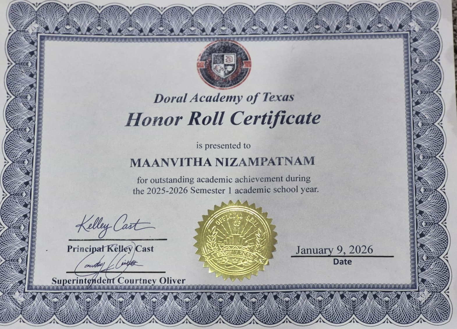 Ms. Maanvitha Nizampatnam has been a dedicated and consistent learner at Enlighten Online for the past couple of years. Her strong academic discipline, positive attitude and commitment to excellence have rightfully earned her this Honor Roll recognition, from Doral Academy of Texas, TX 78610, United States. We